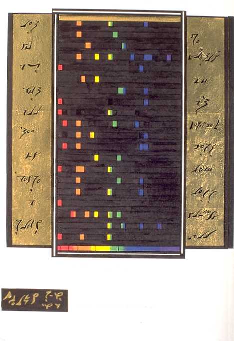 23K gold leaf, pen, brush and ink, coloured pencil, conceptual calligraphy. In private collection.